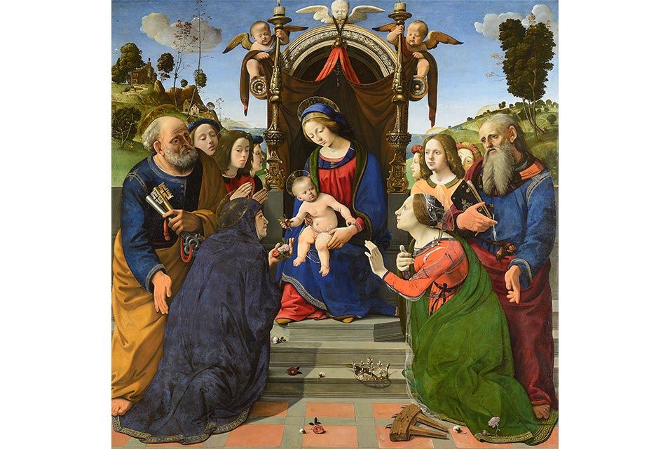 October 02, 1462. Piero di Cosimo (2 January 1462 - 12 April 1522), also known as Piero di Lorenzo, was a Florentine painter of the Italian Renaissance. He is most famous for the mythological and allegorical subjects he painted in the late Quattrocento. In this image: Piero di Cosimo, Madonna and Child Enthroned with Saints Elizabeth of Hungary, Catherine of Alexandria, Peter, and John the Evangelist with Angels, completed by 1493. Oil and tempera on panel, 203 x 197 cm (79 7/8 x 77 1/2 in.). Museo degli Innocenti, Florence.