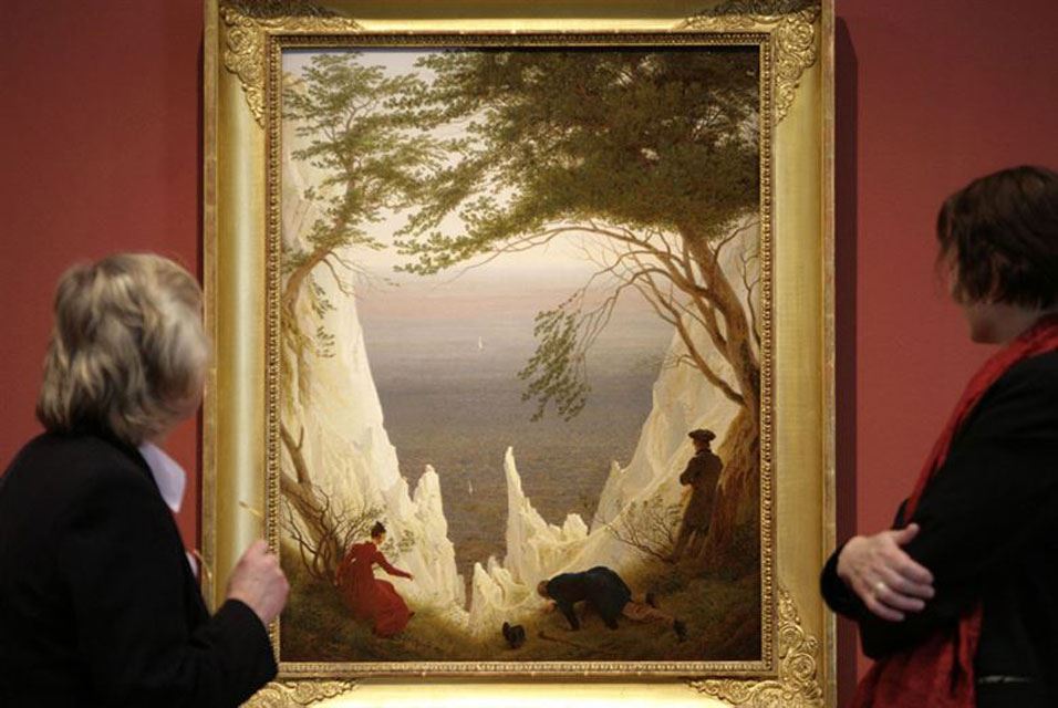 March 05, 1774. Caspar David Friedrich (September 5, 1774 - May 7, 1840) was a 19th-century German Romantic landscape painter, generally considered the most important German artist of his generation. He is best known for his mid-period allegorical landscapes which typically feature contemplative figures silhouetted against night skies, morning mists, barren trees or Gothic ruins. In this image: Two visitors watch the painting "Kreidefelsen auf Ruegen" from 1818 from painter Caspar David Friedrich at the museum Folkwang in Essen, Germany, May 2, 2006. The exhibition "Caspar David Friedrich - Invention of romance" shows a retrospective of the great German painter from May 5 to August 20, 2006.